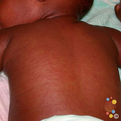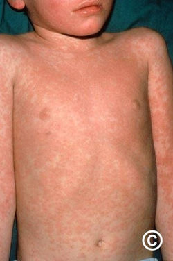 Description: red lacy appearance (spares face), rose-colored macule (post high fever)