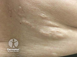 Description: itching, redness, scaling, folliculitis, multiple short broken hairs, hair loss