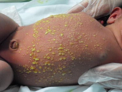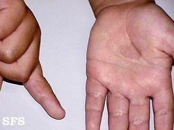 Description: hypomelanotic macules / ash-leaf spots + angiofibroma (small bumps especially around nose + cheeks)
