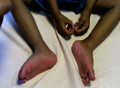 shedding of the skin in large sheets, especially from palms + soles, 1-2 weeks after the onset of illness